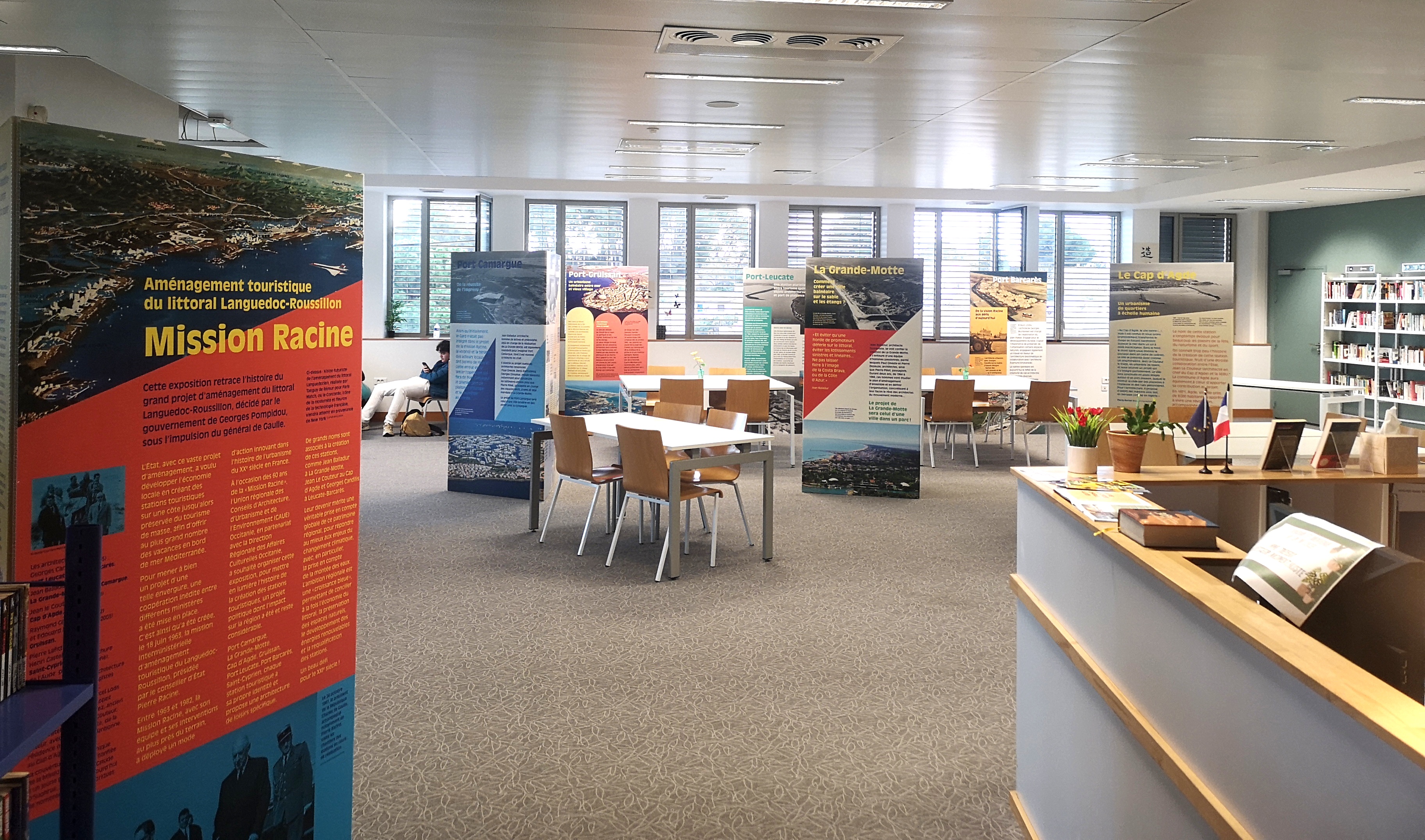 Notre établissement a la chance d'accueillir la récente et très belle exposition du CAUE (Conseil en architecture urbanisme et environnement) sur la "Mission Racine" qui documente la construction de 7 stations balnéaires sur notre territoire : La Grande-Motte et le Cap d’Agde (Hérault), Port Camargue (Gard), Gruissan et Port Leucate (Aude), Port Barcarès et Saint-Cyprien (Pyrénées-Orientales).